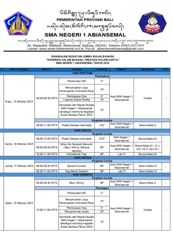 Kegiatan ini diselenggarakan oleh OSIS SMA Negeri 1 Abiansemal bekerja sama dengan panitia guru mata pelajaran Bahasa Indonesia, Bahasa Inggris, Bahasa Jepang . Pelaksanaannya selama empat hari, berbagai lomba baik di bidang studi Bahasa Indonesia, Bahasa Inggris, dan Bahasa Jepang. Setiap cabang lomba diikuti dengan antusias oleh siswa dari berbagai kelas, menunjukkan semangat berkompetisi yang tinggi dan kecintaan terhadap bahasa Indonesia.